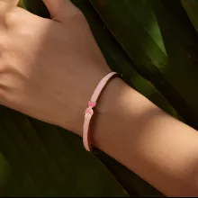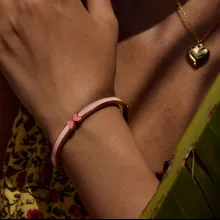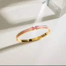 - Delicate bow-shaped bangle in a soft candy pink finish