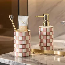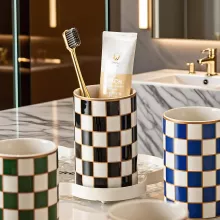 What makes this product special is its blend of beauty and practicality. Its plaid ceramic finish creates a crisp, stylish look that feels both modern and timeless. Use it during your morning routine to keep toothbrushes upright, or place it by your vanity to store makeup brushes and small tools. Its smooth ceramic surface is easy to clean, making it ideal for everyday use.