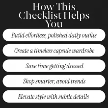 This checklist is perfect for women and men who want to look polished every day without chasing fast fashion. It’s ideal for professionals, students, content creators, or anyone building a refined wardrobe rooted in stability and taste. If you love quiet luxury, capsule wardrobes, and timeless elegance, this was made for you.