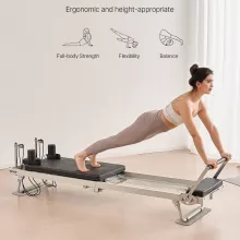 Crafted with a heavy-duty cast iron frame, this Pilates reformer is made for daily, high-intensity use. The sleek design is matched with ergonomic dimensions, accommodating various body types and fitness levels. From strengthening your core to sculpting lean muscle, this reformer does it all. The smooth pulley system and dual resistance setup (spring and cord) ensure an adjustable, quiet, and low-impact experience that targets every major muscle group.