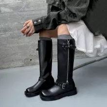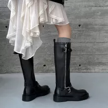 - Design: Knee-high with classic round toe and modern belt buckle accent