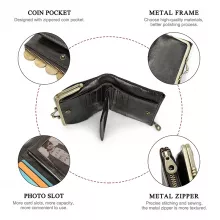 Genuine Leather Women’s Small Wallet with Metal Frame, Hasp & Zipper Coin Pocket