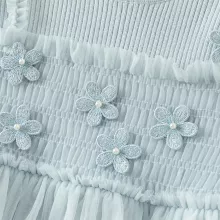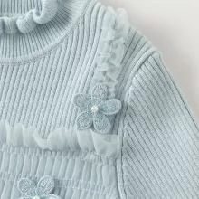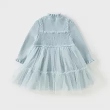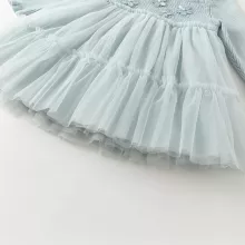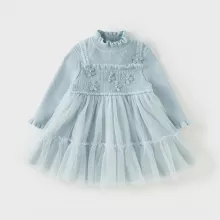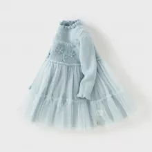 This knee-length A-line dress features a classic crew neck and full sleeves, keeping your child snug during cold weather. The delicate lace overlay and mesh detailing add a dreamy, feminine touch, while the sweet floral accents make it stand out from ordinary kids’ dresses. Whether layered with tights and boots for outdoor wear or worn on its own indoors, this dress brings a blend of cuteness and practicality.