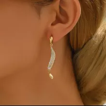 Step into effortless elegance with these stunning gold long leaf zircon drop earrings. Designed with a chic plant-inspired pattern and crafted in radiant KC golden plating, these earrings bring together natural beauty and modern fashion. Their sleek geometric silhouette and shimmering cubic zirconia accents make them the perfect addition to your jewelry collection, whether you’re dressing up for a wedding, evening event, or simply elevating your everyday look.