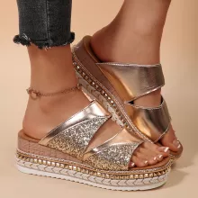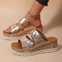 Shine brighter than the sun in these stunning Gold Sequin Wedge Platform Sandals, designed to elevate your summer wardrobe with effortless glamour. Crafted for women who love a bold statement, these high-fashion slides blend shimmering elegance with all-day comfort. Whether you’re heading to a garden party, a sunset dinner, or a city stroll, these sandals are the perfect way to add sparkle to your step.