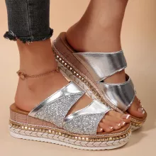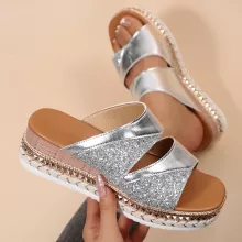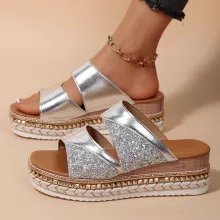 These slip-on sandals feature a dazzling sequin upper that catches the light with every move. A thick rubber sole supports a wedge heel that adds flattering height—rising between 2 to 3 inches—without compromising on comfort. The PU insole and upper ensure a soft touch against your skin, while the open-toe design keeps things breathable and stylish.