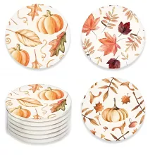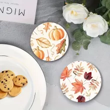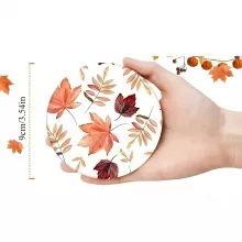 Each coaster features vibrant 2D single-sided color printing that highlights stunning pumpkin leaf designs in golden tones. The back side retains its natural wood color, giving a rustic and authentic feel. Crafted from eco-friendly wood, these coasters are lightweight yet durable — measuring approximately 4 inches in diameter (10 x 10 x 0.12 in) and weighing just 0.35 oz each.