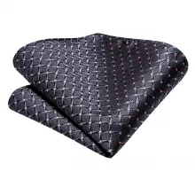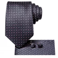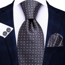 Unlike ordinary ties, this silk accessory set is designed to elevate your wardrobe with versatility and luxury. The grey and pink plaid pattern pairs seamlessly with dark suits and tuxedos, making it suitable for both professional and celebratory occasions. The handkerchief and cufflinks add polished details that transform a simple suit into a statement of sophistication.