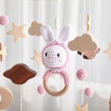 Turn your baby’s crib into a peaceful haven with our Handmade Wooden Baby Crib Mobile, beautifully crafted for infants aged 0–12 months. This charming mobile features soft, hand-crocheted rabbit dolls that gently sway above your baby, accompanied by a delightful musical bell that calms and entertains. Made from high-quality natural wood and soft cotton yarn, this mobile is a blend of safety, style, and sensory engagement.