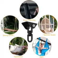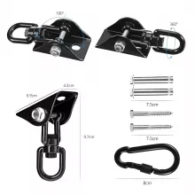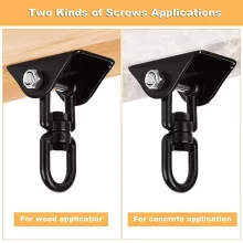 Its sleek black electroplated finish adds a modern touch to your space, while the 180° and 360° swivel design ensures smooth, unrestricted movement for any application. Installation is easy and hassle-free—each kit includes a swing hanger, 2 expansion bolts for concrete, and 2 wood screws for beams or wooden ceilings. In just minutes, you can transform your space into a relaxation haven or fitness zone.