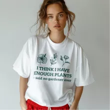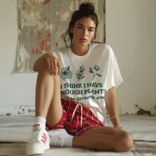 I Think I Have Enough Plants T-Shirt is no ordinary piece of clothing. Its taped neck and shoulders, double-needle sleeve and bottom hems, and quarter-turned construction provide a retail fit for clothing that’s true to size. Plant Lover Heavy Cotton Tee is Designed and printed in California.