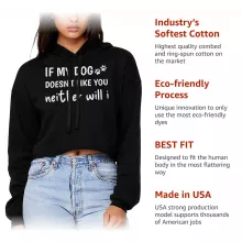 If My Dog Doesn’t Like You Neither Will I Women’s Cropped Hoodie is proudly made with 7x less water than average manufacturers, in recycle-friendly facilities that also guarantee zero sweatshop conditions. Dog Love Women’s Cropped Hoodie is designed and printed in California.