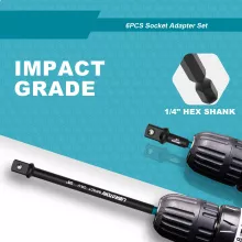 Each adapter is made from premium chrome vanadium steel (Cr-V) and heat-treated to meet impact grade standards. A rust-resistant black phosphate coating adds extra durability, making these extensions ready for rugged, long-term use. The 1/4″ hex shank fits all standard drill chucks and quick-change systems, transforming your impact driver into a powerful socket driver in seconds. Built with ball detent retention and chamfered edges, these adapters lock sockets firmly in place and slide in smoothly every time.