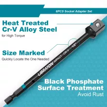 - 6-Piece Versatile Set: Includes 3” and 6” adapters in 1/4″, 3/8″, and 1/2″ square drive sizes.