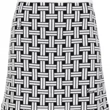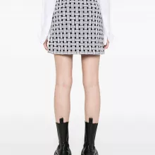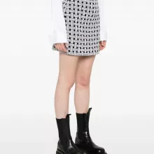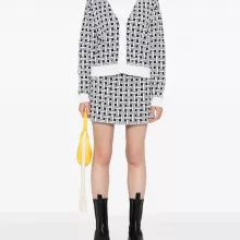 Crafted from a premium cotton and wool blend, the skirt features a textured jacquard knit that adds dimension and structure without compromising on comfort. The ribbed, elasticated waistband offers an easy, flattering fit, while the thigh-length cut and straight hem create a sleek silhouette that works from day to night. Finished with a subtle logo motif woven into the pattern, this skirt doesn’t just follow trends—it sets them.