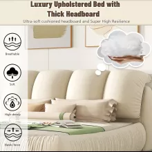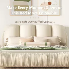 Ideal for master bedrooms or guest rooms, this bed is at its best when you’re ready to relax in style. Its modern, low-profile design and neutral beige tone fit effortlessly into any decor, while the overstuffed headboard adds a cozy, inviting touch. Built from solid engineered wood and covered in soft faux leather, it’s as sturdy as it is stylish — and thanks to its squeak-free structure, your peaceful rest won’t be interrupted.