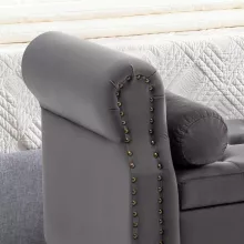 - Elegant Modern Design: The bench is upholstered in luxurious velvet with button tufting, complemented by a studded trim and rolled arms, creating a refined and stylish appearance.