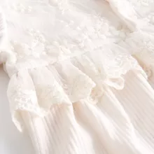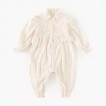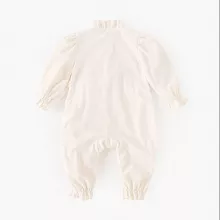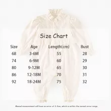 The romper includes lovely lace floral embellishments on the chest, paired with lace-trimmed edges that highlight its feminine, timeless charm. Ruffled details at the collar, cuffs, and leg openings add extra cuteness. For busy parents, the covered snap buttons down the front and between the legs make dressing and diaper changes quick and easy. Sized to fit babies from 3 to 24 months, it comfortably supports little ones ranging from 21 to 27 inches in length. The fabric is soft, smooth, and gentle on delicate skin, ensuring your child feels great during every wear.
