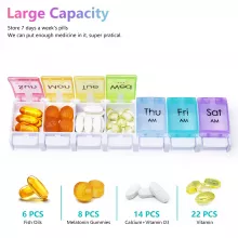 - Large compartments designed to fit vitamins, fish oil, and daily supplements