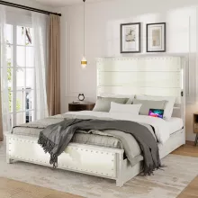 Transform your bedroom into a functional, stylish haven with this LED bed frame featuring a tall upholstered headboard, built-in charging station, and spacious under-bed storage drawers. Designed with the perfect blend of rustic farmhouse charm and modern innovation, this bed is more than just a place to sleep — it’s a centerpiece that enhances your daily routine.