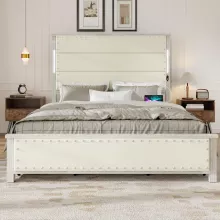 This soft-pack bed frame is expertly crafted using durable melamine fiberboard and reinforced with metal for lasting strength. The 53.14-inch tall headboard is padded with plush sponge and wrapped in white leather and non-woven fabric, offering both visual appeal and comfort. Whether you’re reading, relaxing, or winding down for the night, the full-touch LED light strip lets you choose from three brightness levels to match the mood. Need to charge your phone or plug in a bedside lamp? The built-in charging station with one USB and one Type-C port has you covered.