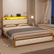 Our bed frame isn’t just about good looks; it’s packed with features that enhance both convenience and usability. The highlight is the innovative headboard, equipped with integrated LED lights for a serene ambiance and a built-in USB port and shelf for easy access to your essentials. Whether it’s a late-night read or charging your devices, everything you need is within arm’s reach.