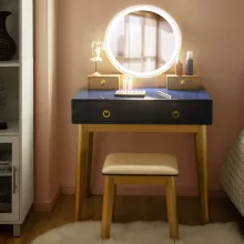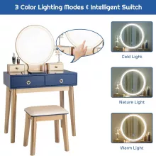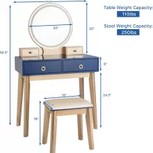 Makeup Vanity Desk with Lighted Mirror, Navy Blue, 4 Drawers & Stool