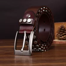 The edgy, strategically placed rivets are what set this belt apart. This isn’t just decorative; it’s a signature of punk and motorcycle culture. The cold, hard metal against the warm, aging leather creates a striking contrast that screams authenticity and attitude, making it a truly personalized, niche statement piece.
