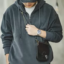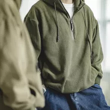 What sets this hoodie apart is its double-sided fleece construction. Unlike standard hoodies that only feel warm on the inside, this one delivers plush comfort inside and out. The fabric feels soft to the touch, resists pilling, and holds its shape over time. The stand collar with an attached hood gives extra protection from cold wind, while the non-zip pullover design keeps the look clean and minimal.