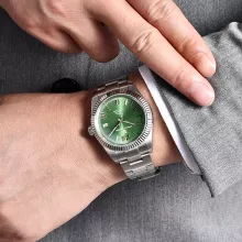 Featuring a bold, numberless dial housed beneath a durable sapphire crystal mirror, this watch is built to turn heads. Its high-performance Japanese-origin automatic and hand-wind movement ensures precise timekeeping without the need for batteries. The polished stainless steel band and case not only provide a refined finish but also ensure long-lasting durability. With a folding clasp and safety lock, this piece stays secure on your wrist through every moment.