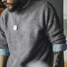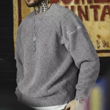 This sweater is built for comfort and easy styling. It has a classic round neckline, full-length sleeves, and a ribbed hem that helps maintain its shape. The fabric is flat knitted for a smooth finish and a clean, retro look. The solid grey color makes it easy to match with jeans, joggers, or layered over a shirt.