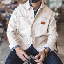 Step out in effortless style with this men’s vintage white denim jacket, designed for early autumn wear. Featuring a distinctive square neckline and raglan sleeves, this jacket brings a fresh twist to classic workwear aesthetics. Made from durable cotton twill fabric with a polyester lining, it offers the perfect balance of comfort and durability for your daily adventures.