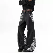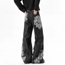 What sets these jeans apart is their unique mix of classic denim and bold modern design. Unlike plain jeans, they feature floral-inspired elements and contrast coloring that add personality without looking overdone. The loose straight-leg cut gives you freedom of movement, making them perfect for all-day wear. They’re also made with soft-touch cotton fabric that feels smooth on the skin and holds its shape well over time.