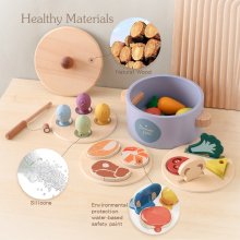 This wooden toy set is crafted with smooth, non-toxic materials, ensuring safe play for children. The set includes colorful wooden carrots, a pot for pretend cooking, fishing accessories, and multiple shape-matching pieces. Each component is thoughtfully sized for toddlers and preschoolers to grasp, promoting fine motor development and hand-eye coordination. Its bright colors and versatile design keep kids engaged for hours of fun.