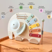 Introduce your little one to the joyful world of sound with this enchanting Montessori-inspired wooden music table. Designed as a friendly elephant, it brings together a colorful xylophone, a soft-tone drum, and playful rod bells—inviting babies and young children to explore rhythm, melody, and movement. Crafted from smooth, kid-safe wood, this music set is made for tiny hands and curious minds.
