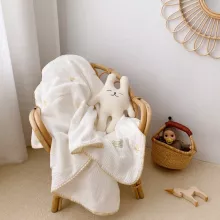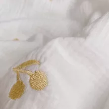 What sets our blanket apart is its meticulous craftsmanship, combining traditional muslin cotton with modern elegance. The delicate lace edges and charming cherry embroidery make it a delightful addition to your baby’s essentials. Whether you’re looking for a practical swaddling solution or a thoughtful gift, this blanket offers both style and comfort in one.