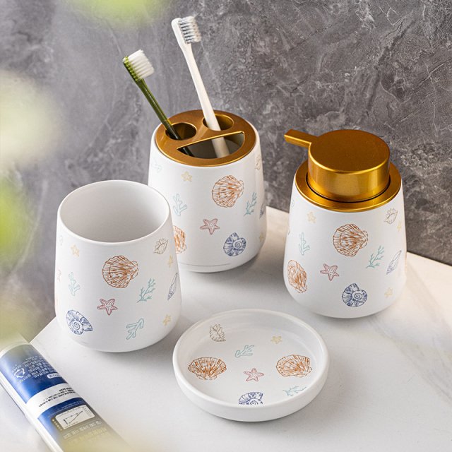 Crafted from durable ceramic, this bathroom set is designed to withstand daily use while keeping its elegant appearance. The ocean-inspired patterns will catch your eye and brighten your bathroom decor, creating a serene atmosphere that makes you feel as if you are by the sea. The pieces are also easy to clean, ensuring that they remain vibrant and beautiful over time.