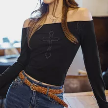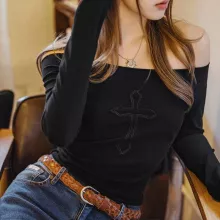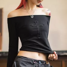 Step up your casual style with this black off-shoulder long sleeve crop top—where comfort meets attitude. With its sleek silhouette and modern midriff-baring cut, this top adds a hint of sultry charm to your everyday wardrobe. Designed with thoughtful details like cross patch embroidery and rolled cuffs, it’s the kind of piece that effortlessly pairs with everything from high-waisted jeans to statement skirts.