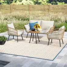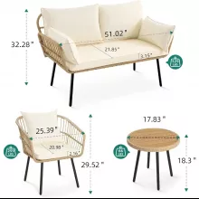 Transform your outdoor space into a luxurious retreat with our Outdoor All-Weather Rattan Conversation Set. This 4-piece sofa set includes a love-seat, two armchairs, and a coffee table, providing ample seating for you and your loved ones to enjoy leisurely moments together.
