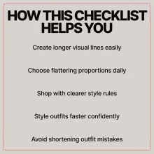 This checklist is perfect for petite women, anyone who feels shorter than they’d like, or anyone who wants to create a more balanced, elongated look. Whether you’re styling casual outfits, workwear, or dressy looks, this guide adapts easily to your lifestyle.