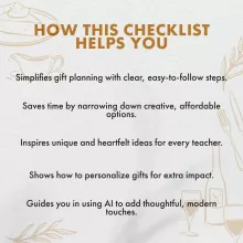 Unlike other gift guides, this one is tailored specifically for Thanksgiving, focusing on budget-friendly, practical, and personalized gift ideas that teachers will truly appreciate. It helps you avoid generic gifts and gives you the tools to create something that shows real thoughtfulness. Plus, the integration of AI suggestions adds a modern twist, giving you fresh, creative ideas that might never have crossed your mind.