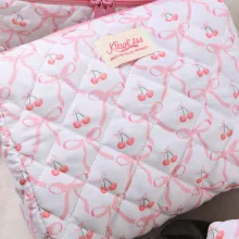- Design: Quilted texture with cherry print and pink bow accent