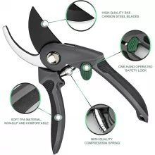 The ergonomic non-slip handle ensures a firm, comfortable grip ideal for medium to large hands, while the high-quality compression spring reduces hand fatigue, letting you work longer without strain. A secure one-hand safety lock keeps the blades closed when not in use, protecting both your fingers and the shears. Built to last and designed to impress, these shears are a must-have for any gardening enthusiast.