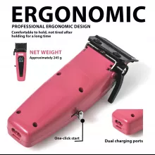 Enjoy exceptional cutting performance thanks to durable DLC-coated stainless steel blades that glide through all hair types with ease. With five adjustable cutting lengths from 0.02 in to 0.10 in, plus eight additional limit combs ranging from 0.06 in to 0.75 in, you can achieve fades, tapers, trims, and full haircuts with precision. A long-lasting lithium battery provides up to 180 minutes of usage, and the LED display keeps you informed about remaining power. The included trimmer operates at 7200RPM, perfect for detail work, outlining, and finishing touches.