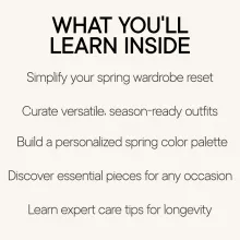 - Chapter 4 – Styling Formulas for Easy Spring Outfits: Learn how to effortlessly put together casual, workday, and evening looks using the essential spring pieces you already own.