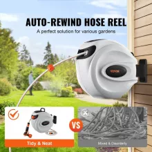 - Automatic Rewind System: With a gentle tug, this hose reel automatically retracts, keeping your space clean and clutter-free. Say farewell to messy hose piles and difficult rewinding!