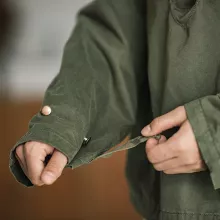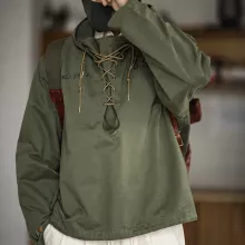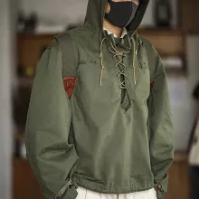 Retro Green Hooded Pullover Jacket with Adjustable Drawstring Design