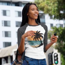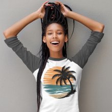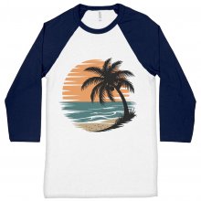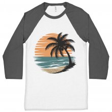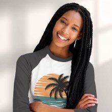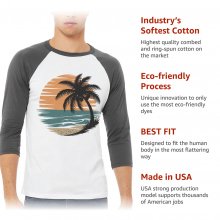 Retro Tropical Sunset Baseball T-Shirt is proudly made with 7x less water than average manufacturers, in recycle-friendly facilities that also guarantee zero sweatshop conditions. Trendy Aesthetic 3/4 Sleeve is designed and printed in California.