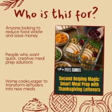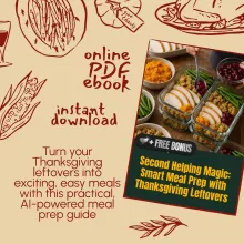 This guide is perfect for anyone looking to make the most out of their Thanksgiving leftovers. Whether you’re a seasoned meal prepper or new to the concept, “Second Helping Magic” offers easy-to-follow advice, AI-generated recipe ideas, and pro tips on reducing food waste. Plus, it’s all in a convenient digital format, making it easy to refer to whenever you need it.