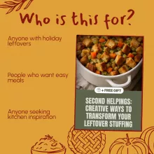 - Chapter 2: Delicious Transformations – Explore quick reheats, hearty casseroles, and unexpected creations like stuffing pancakes and fritters.
